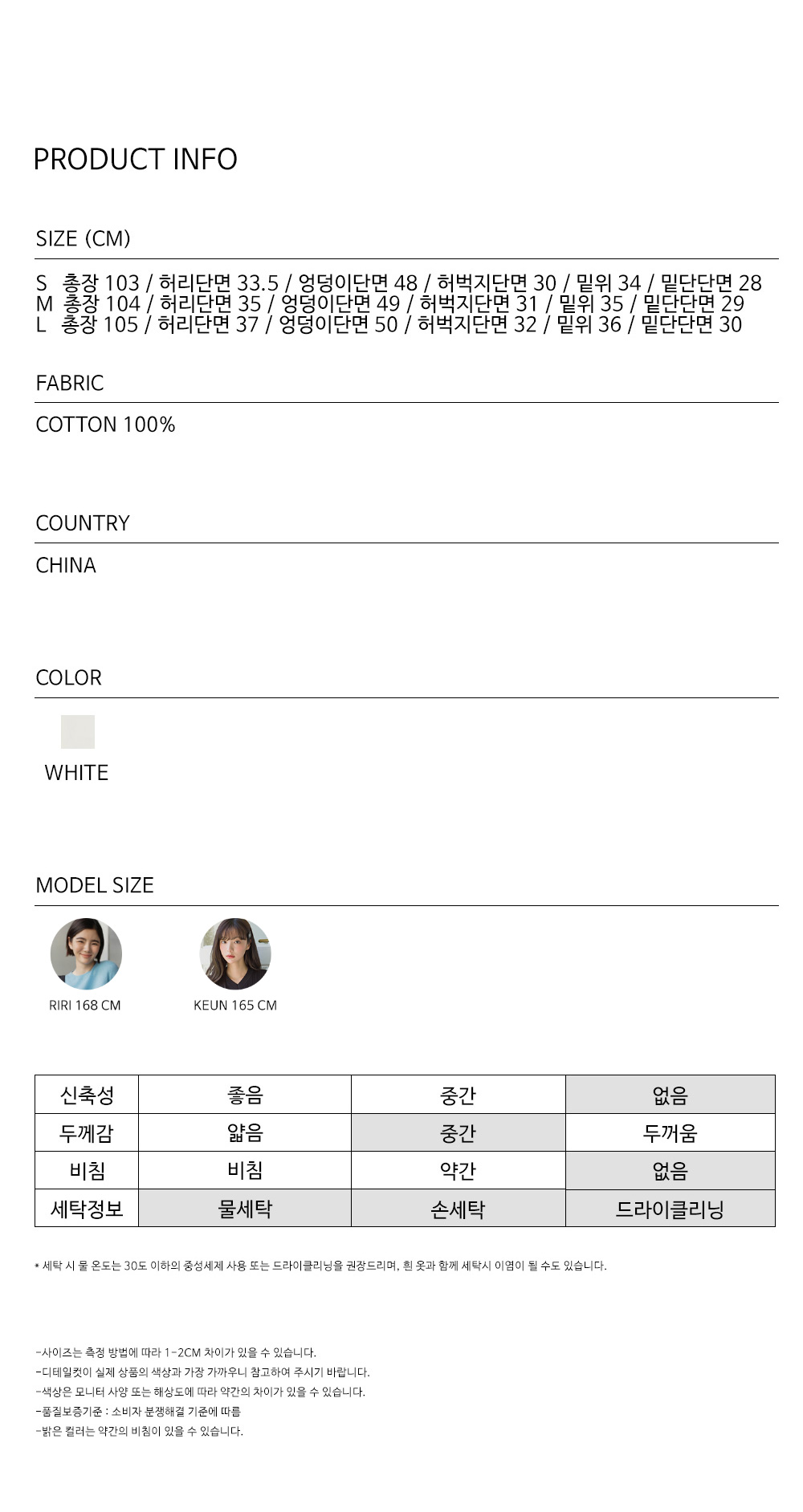 褲長 103 / 104 / 105 | 腰寬 33.5 / 35 / 37 | 臀寬 48 / 49 / 50 | 大腿 30 / 31 / 32 (CM)
